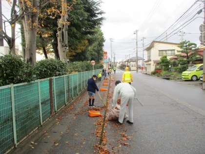 5年生の子供たちと一緒に、熊手や箕を使ってたくさんの落ち葉を拾いました。