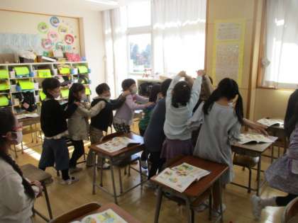最後は題名の「こうしんきょく」の通り、教室中を行進して楽しみました。