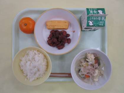 こんだて ごはん 牛乳 厚焼き卵 塩こうじ鍋 みかん 煮豆