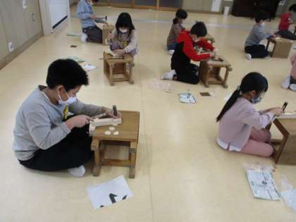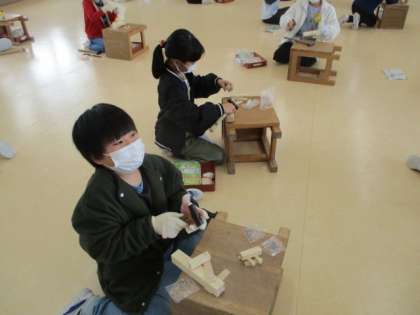 図画工作科では、くぎと金づちを使って木の作品を製作中です。安全に気をつけながら、くぎを打つ順番や打ち方に工夫を凝らしています。打ち込む本数によって動きも出るのでどんな作品にしようかと試行錯誤する過程も楽しんでいます。