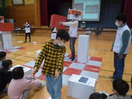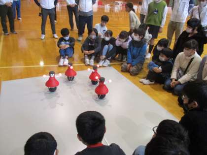 「動け!!せんせいロボット」というプログラミング体験をしました。タブレットに動作を入力し、『はじめる』を押すと先生ロボットが動き出します。実際に自分の体でどのように動くのかを確認してプログラムを組む姿もあり、楽しみながら学習することができました。最後には、チアリーディング部の演舞を見ることができました。