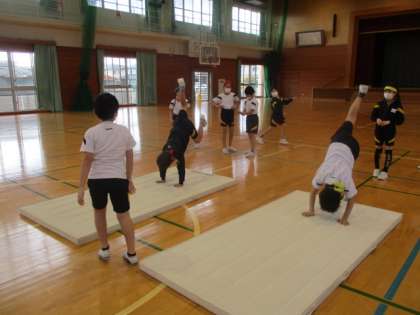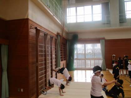 体育では、倒立にチャレンジしました。それぞれのレベルに合わせて、かべのぼり倒立、かべ倒立、倒立前転の3つの技に取り組みました。