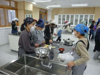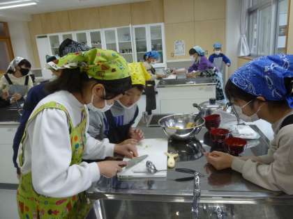 昨日立てた調理計画を基に、お味噌汁を作りました。にぼしの頭とはらわたを取り除いて出汁をとったり、火をとめてから味噌を入れたりするなど、さまざまな点に気を付けて調理することができましたね。食事をするテーブルやいすの準備を、早くできあがった班が率先して学級分準備するなど、家庭科の授業でも協力して活動しました。