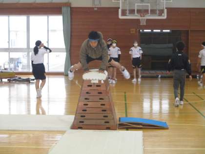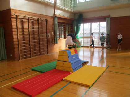開脚跳びや、台上前転など跳び箱での技をより高めようと、アドバイスをしあっています。
