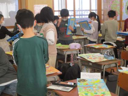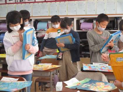 友達の作品を鑑賞しました。色づかいや形、アイディア等、すてきなところを見付け合い、温かい言葉が教室中にあふれていました。
