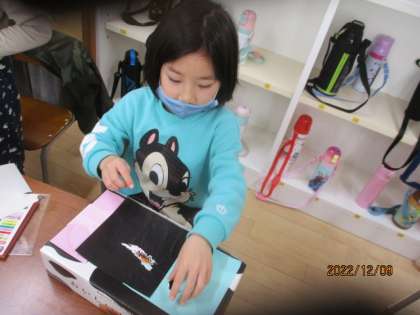 図工の学習では、算数の「かたちあそび」の学習で使った箱をかざりつけました。何を入れるか楽しみですね。