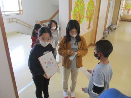 外国語であいさつをしています。下学年の子供たちにも、やさしく話しかけていました。