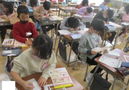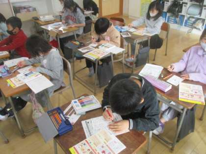 今日は「もらってうれしい」年賀状になるために、「丁寧な字で」「がんばりたいことや、日頃のお礼を伝える」「イラストやきれいな色遣いで美しく」をポイントとして、一人一人が心を込めて年賀状を書きました。
