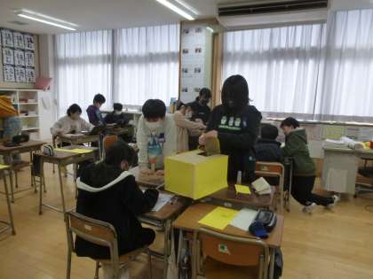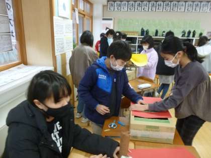 SDGsの取り組みとして、書き損じはがきや切手の回収に取り組んでいます。「私たちが使わない物でも、集めることで誰かの助けになる」という思いで始まりました。ポスターや回収箱の制作を行い、学校内だけでなく地域でも回収を行います。地域の方の協力も得て、少しでも集まるよう頑張りましょう!