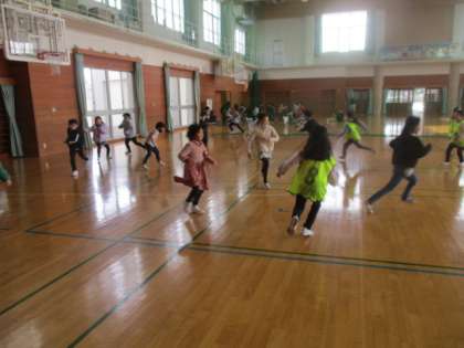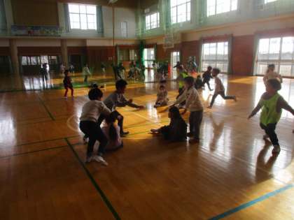 子供が提案した「レンジおに」で、みんなで楽しく遊びました。「こうしたらもっと楽しい」を言葉で伝え合います。お互いの気持ちが分かり、さらに仲良くなった子供たちでした。