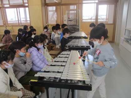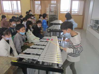 学習の最後には鉄琴で弾いて、さらに曲の雰囲気を感じている子供たちでした。