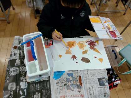 図画工作科では、拾ってきた葉っぱを画用紙にならべて葉っぱの周りに色を塗る活動を行いました。子供たちは思い思いの色を塗り、自然と触れ合いました。