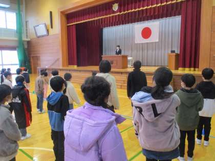 5年生の子供たちは、心のひきしまった態度で終業式にのぞみ、校長先生の話を真剣に聞いていました。全校や地域のために働く5年生のよさを紹介していただき、3学期も継続して頑張っていこうという思いをもちました。