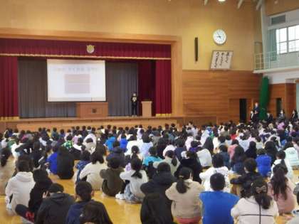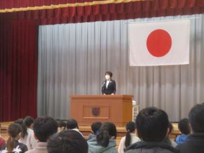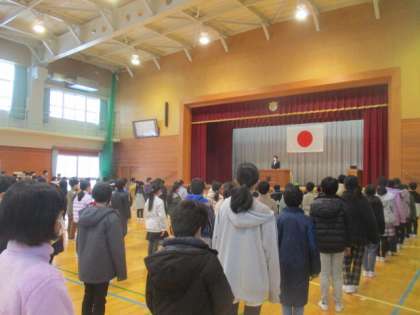 校長先生の式辞では、一人一人が2学期を振り返り、できるようになったこと、がんばったことを見つけて、3学期はさらに伸ばしていこうというお話がありました。また、自分の命は自分でしか守れないので、大切に守っていこうというお話もありました。