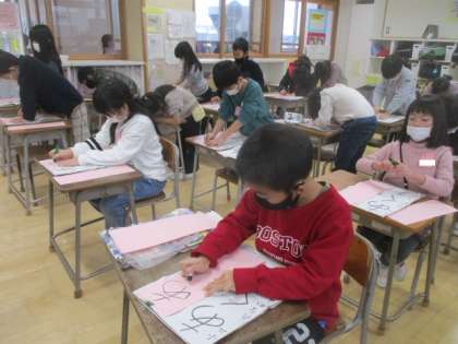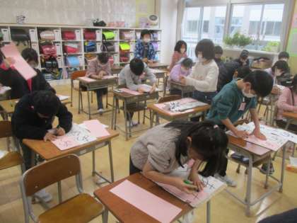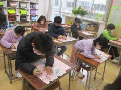 冬休みに練習をがんばった書き初め大会を行いました。真剣に1画1画とめはねはらいに気を付けて書いていました。