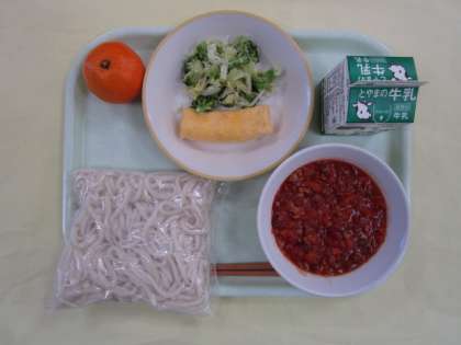 こんだて ソフト麺 ミートソース 牛乳 卵ロール グリーンサラダ みかん