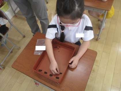 算数科「おおきなかず」の学習で、生活科で育てた朝顔の種の数を数えました。