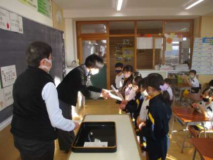 1学年 書き初め大会表彰 公開日 2023/01/11 更新日 2023/01/11 1年生 校長先生に書き初め大会の賞状をもらいました。 金色の紙に、朝から心がドキドキ・ウキウキした子供たちでした。 来年の書き初め大会も楽しみです。
