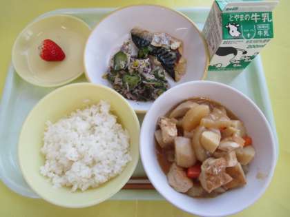 こんだて ごはん 牛乳 さばの塩焼き えのきの梅肉和え のっぺい いちご