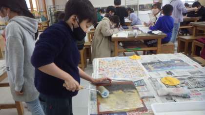 今日は、業者の方と版画の印刷をしました。自分たちが描いて彫り、色をつけた自画像が紙に写る様子を見て、驚いたり、喜んだりしていました。