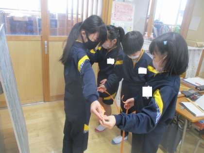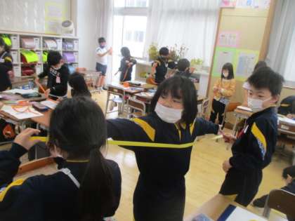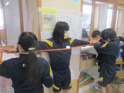 実際に自分たちで紙テープや30cm物差しを使って長さを測ってみると、30cm物差しをつなぎ合わせて測るのは大変だと分かりました。大きな物差しや、大きな単位(m)があると便利だと感じることが出来ました。