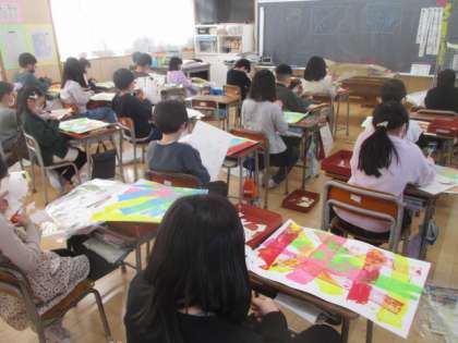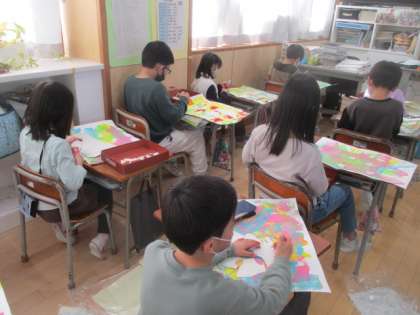 ローラーを使ってカラフルにした紙に、シールを貼り付けました。