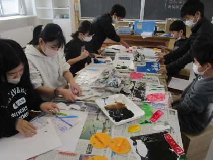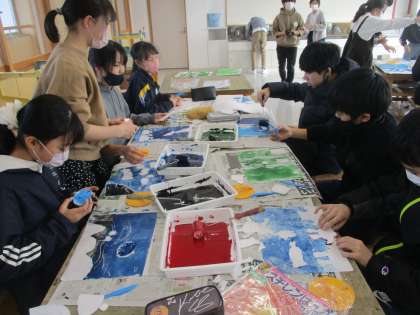 スチレンボードに色を付け、版画を刷りました。彫り方や絵の具の量を工夫し、完成しました。