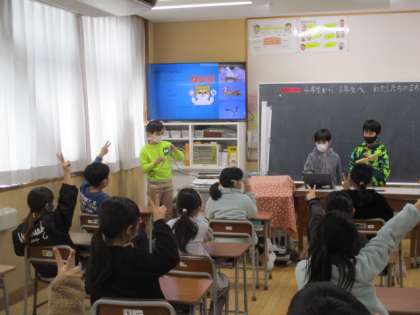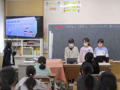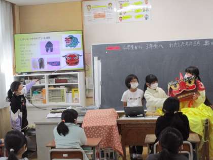 総合的な学習の時間に調べたりまとめたりした「奥田北の宝物」を、3年生に発表しました。3年生にも分かりやすく物を見せたりクイズにしたりしながら発表することができました。
