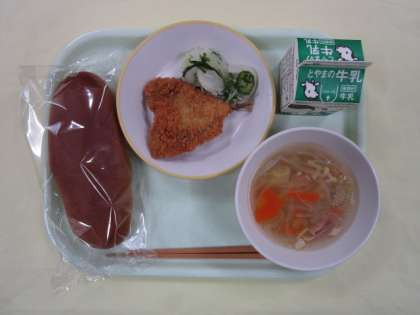 こんだて 黒糖コッペパン 牛乳 あじフライ かぶのサラダ マカロニスープ
