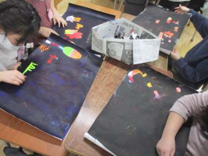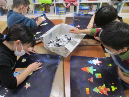シールをめくるときれいな色が出てくることに感動し、とても楽しく活動することができました。「こんなきれいになると思わなかった」「夢の中みたい」と子供たちらしい表現が多くありました。また、やってみた後に「お花畑にしたらすごそう」「花火にしたらすごそう」と考える子供たちでした。