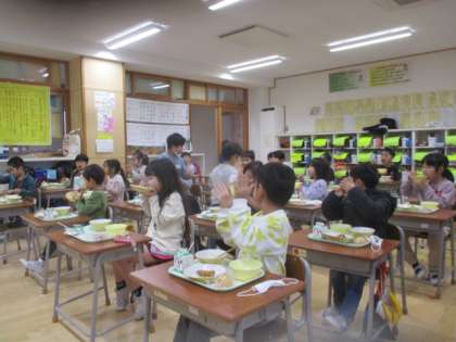 給食時、奥田北っ子のがんばりを全校児童にお伝えする、「がんばり紹介」の放送がありました。