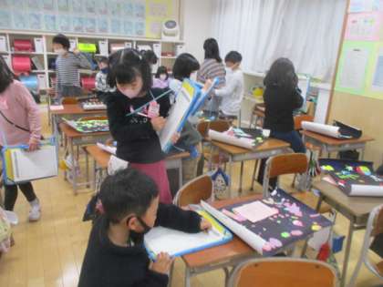 みんなが作ったローラー版画の絵を鑑賞しました。