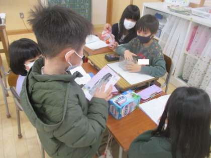 さまざまな箱の形を確認し、どのような特徴があるか調べました。