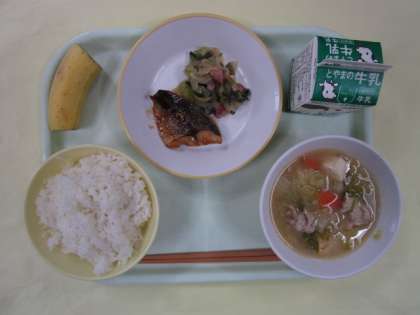 こんだて ごはん 牛乳 あじのみりん焼き チンゲンサイソテー 豚汁 バナナ
