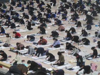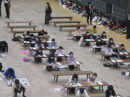 張り詰めた空気の中、奥田北小学校の代表の子供たちも、練習の成果を出し切るように一生懸命揮毫していました。