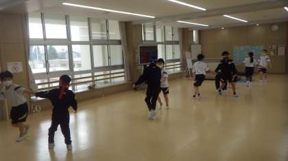 リズムに乗ってダンスをしたり、忍者の動きを再現したりして、友達と楽しみながら体を動かしています。