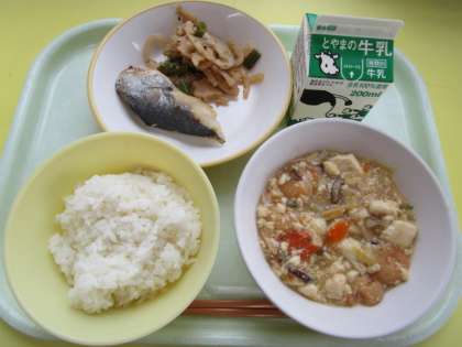 こんだて ごはん 牛乳 鰆の西京焼き 蓮根のきんぴら えびととうふのうまに