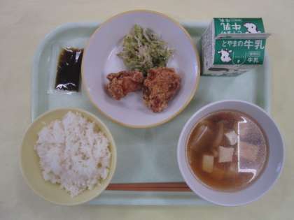 こんだて ごはん 牛乳 鶏肉の竜田揚げ ゆかり和え けんちん汁 のり佃煮