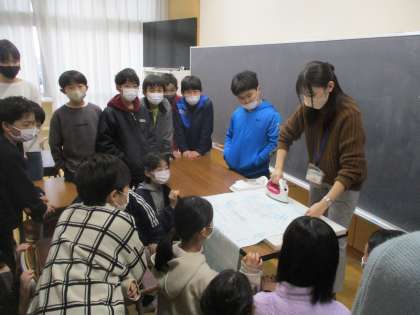 家庭科では、ミシンとアイロンを使ってエプロンづくりをしています。
