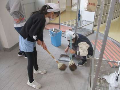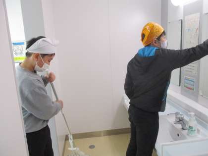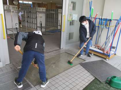 お世話になった校舎に恩返しをしようと、階段やトイレ、玄関などを清掃しました。限られた時間のなかで、一生懸命取り組みました。