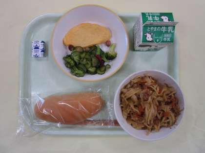 こんだて コッペパン 牛乳 焼きそば オムレツ ビーンズサラダ ポケットチーズ