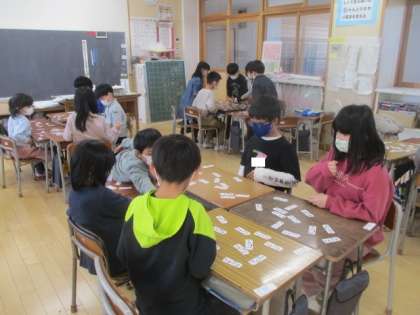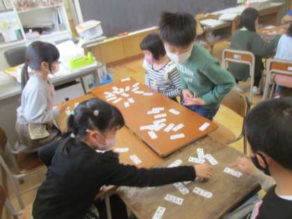 言われた九九の答えを言いながら、九九カードを取るカルタをしました。
