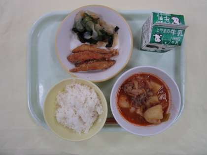 こんだて ご飯 牛乳 わかさぎのフリッター こんにゃくサラダ ボルシチ