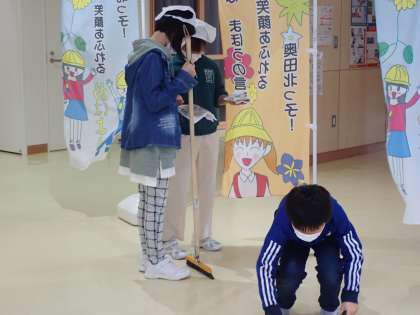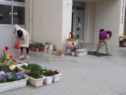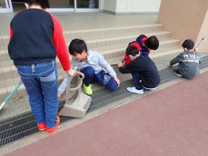 「ごみをとろう」「たわしでこすろう」「水をまこうか」など、友達と声を掛け合いながら、気付いたことを行動に移していました。