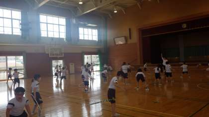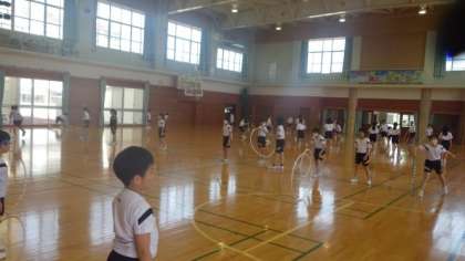 今日はフラフープを使っていろいろな動きを行いました。一人でフラフープを操作したり、2人ペアになってフラフープを転がしたりしました。