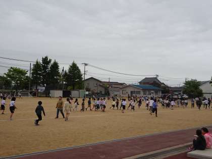グラウンドでは、トラック外回り、内回りを使ってランニングに挑戦です。