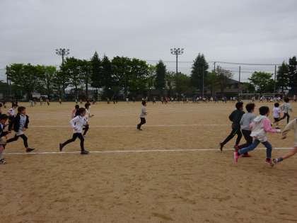 「○周走ったよ。」と教えてくれる子、「歩いてもいいから止まらないようにしよう。」と友達に話しかける子、それぞれに考えて前向きに活動していました。
