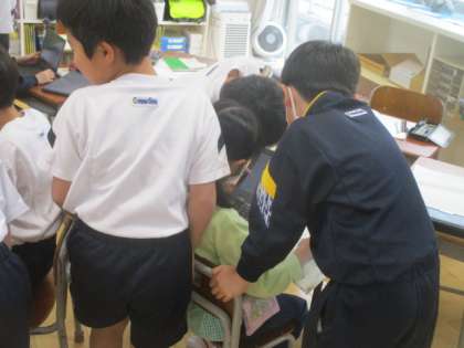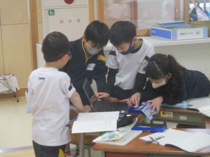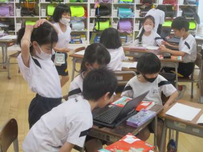 自分たちが音読した様子を、クロムブックの動画を見てふり返りました。「思ったより声が小さい」「姿勢がいいね」と、よいところと改善したいところを見つけていました。
