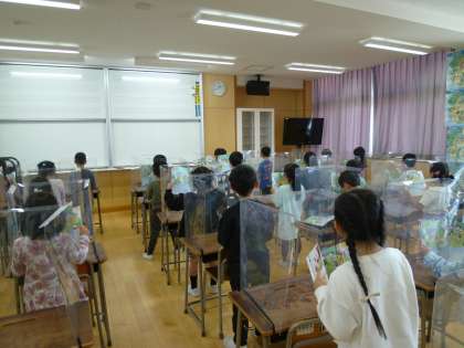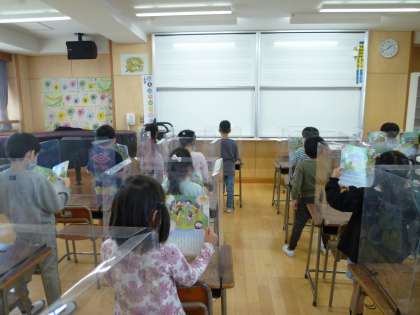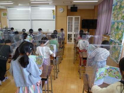 姿勢に気を付けて歌いました。みんなで手をつないで、「ひらいた」や「つぼんだ」を表現しました。