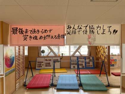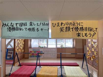 児童玄関には運動会に向けて各団のスローガンが掲示されています。